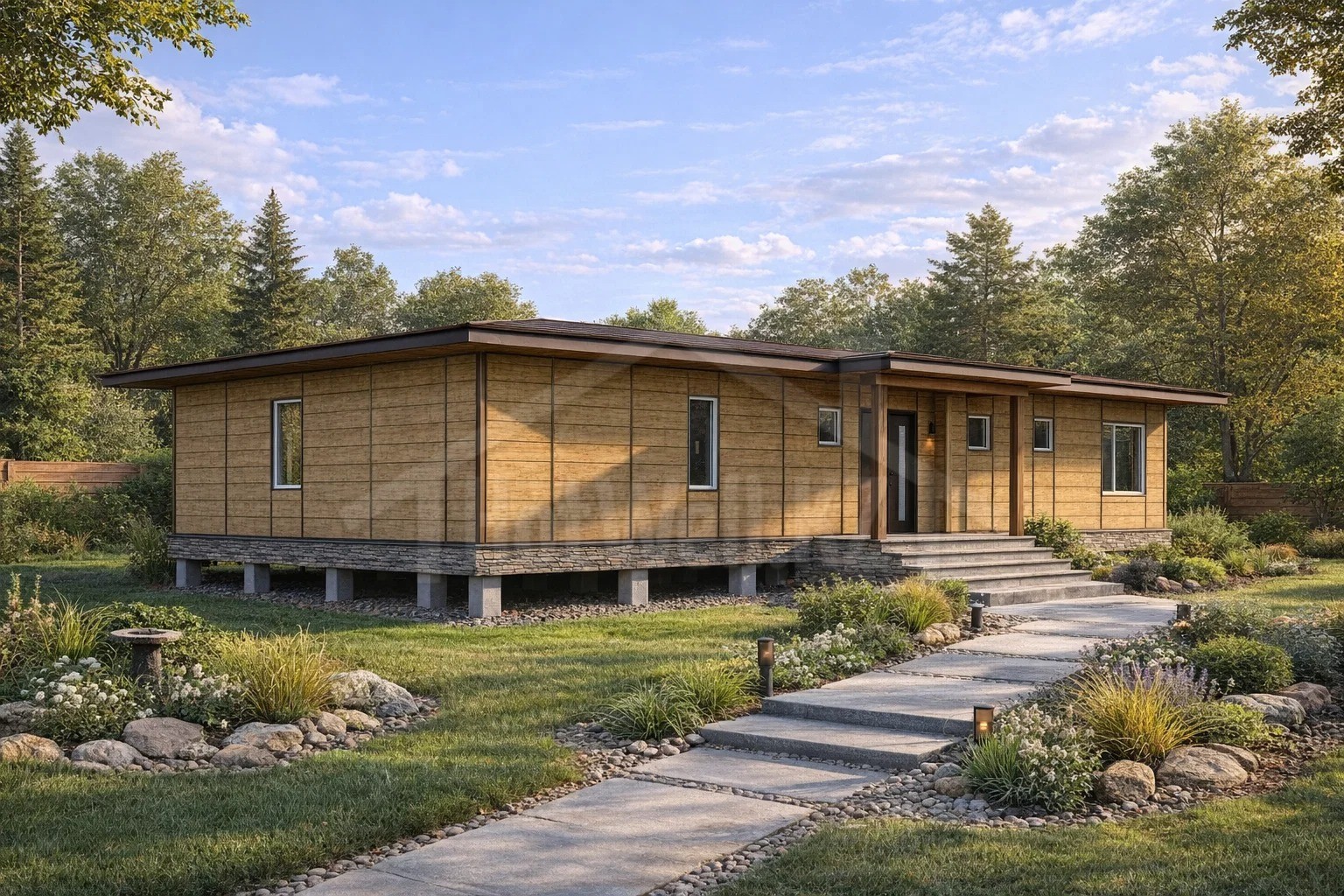 Дом выполнен в одном этаже, что делает его удобным для повседневной жизни. Все помещения находятся на одном уровне, благодаря чему пространство используется максимально рационально и комфортно.