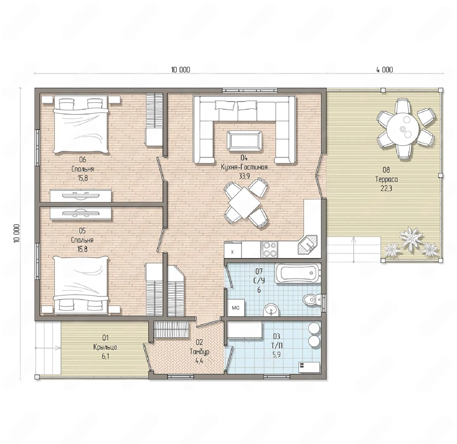 Одноэтажный дом 14 на 10 метров, общей площадью 94 м2, из СИП панелей, с бойлерной, террасой и спальней на первом этаже.