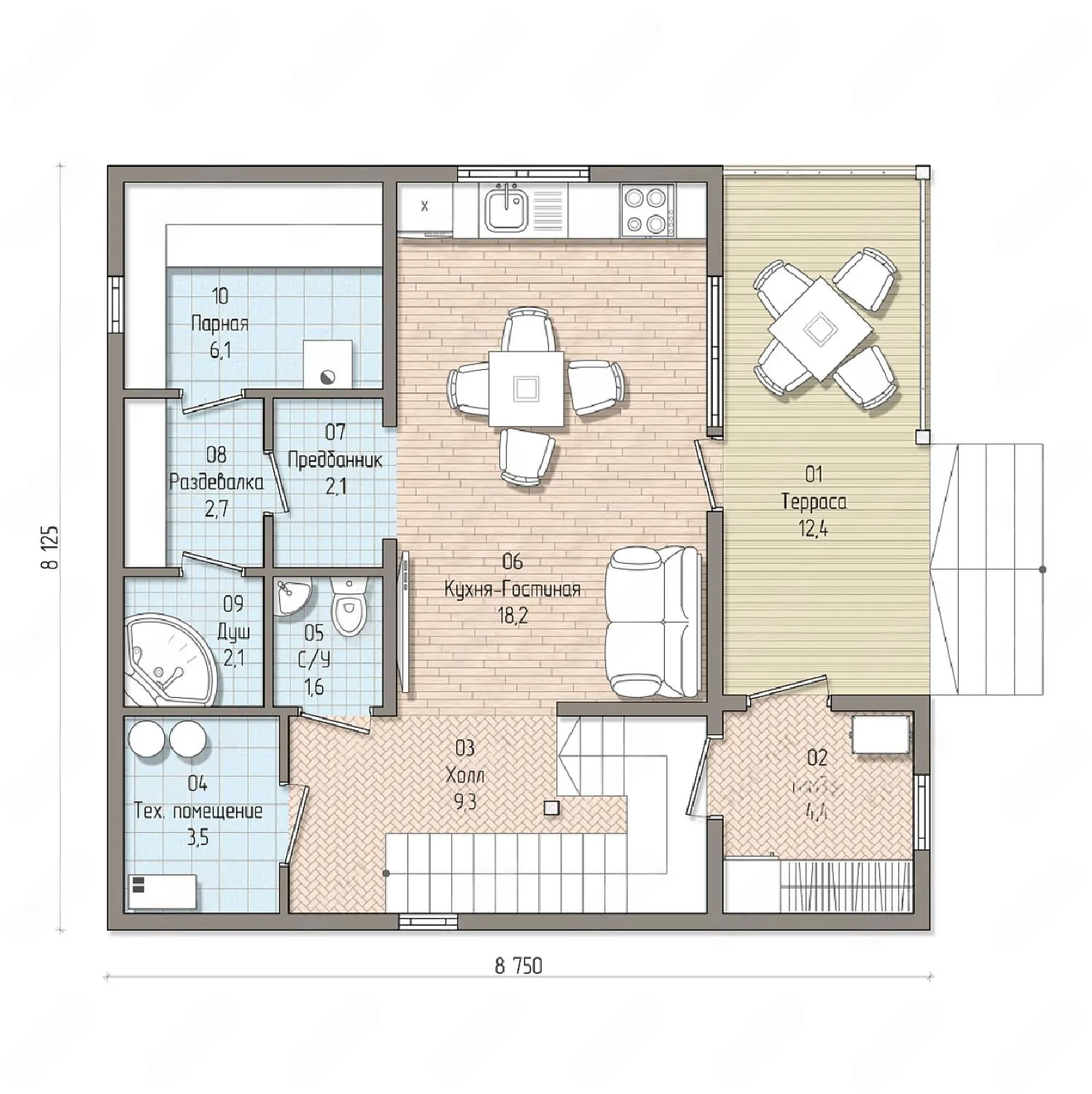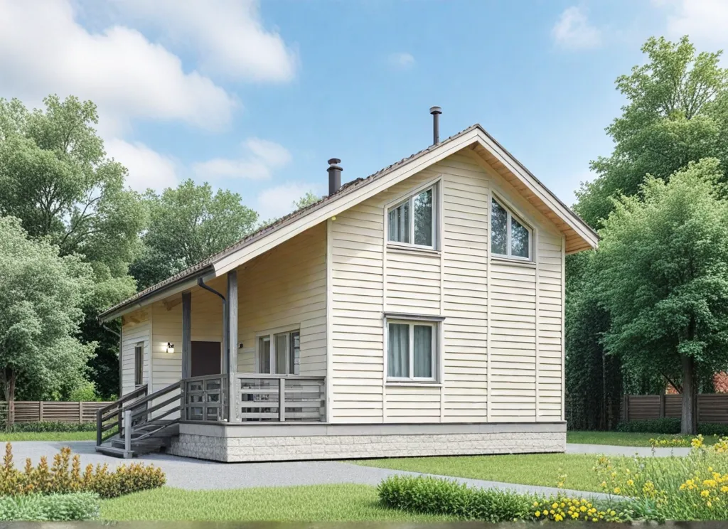 Дом с мансардой 9 на 8 метров, общей площадью 108 м2, из СИП панелей, с сауной, бойлерной и террасой.