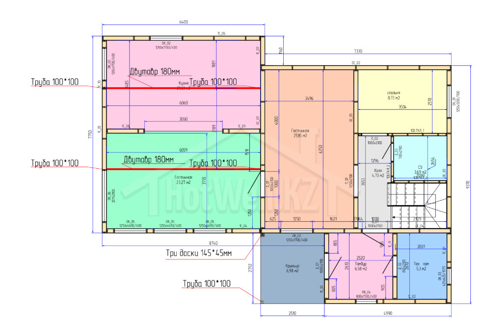 Проект предусматривает двускатную крышу, которая отличается надежностью, простотой конструкции и долговечностью. Такая крыша хорошо защищает дом от осадков и подходит для различных климатических условий.