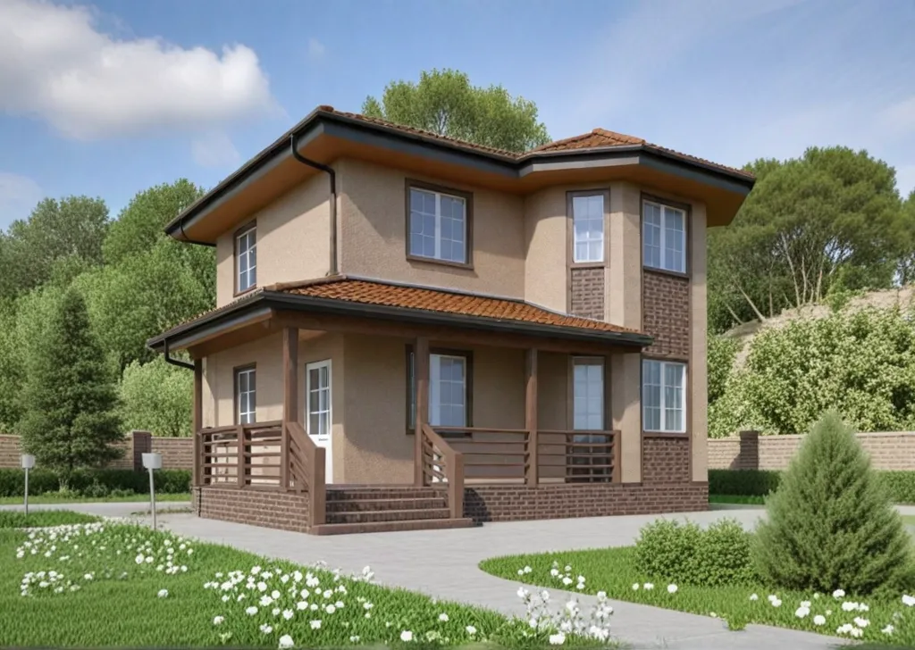 Двухэтажный дом 9 на 8 метров, общей площадью 96 м2, из СИП панелей, с бойлерной, террасой и эркером.