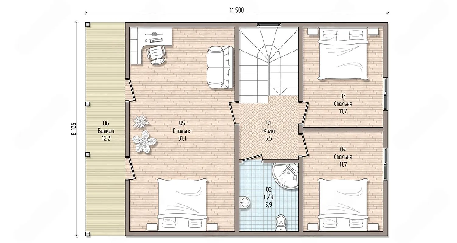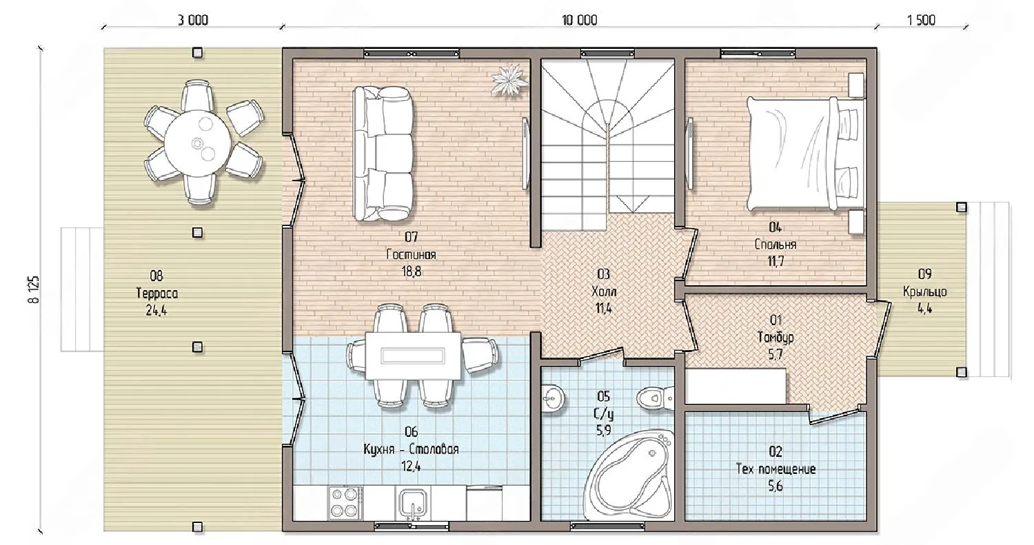 Дом с мансардой 15 на 8 метров, общей площадью 203 м2, из СИП панелей, с бойлерной, террасой, балконом и спальней на первом этаже.
