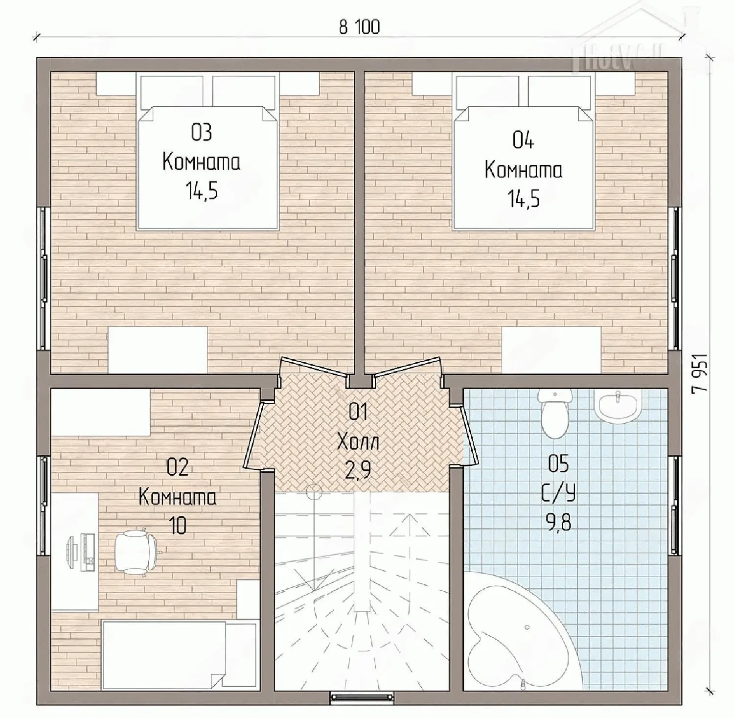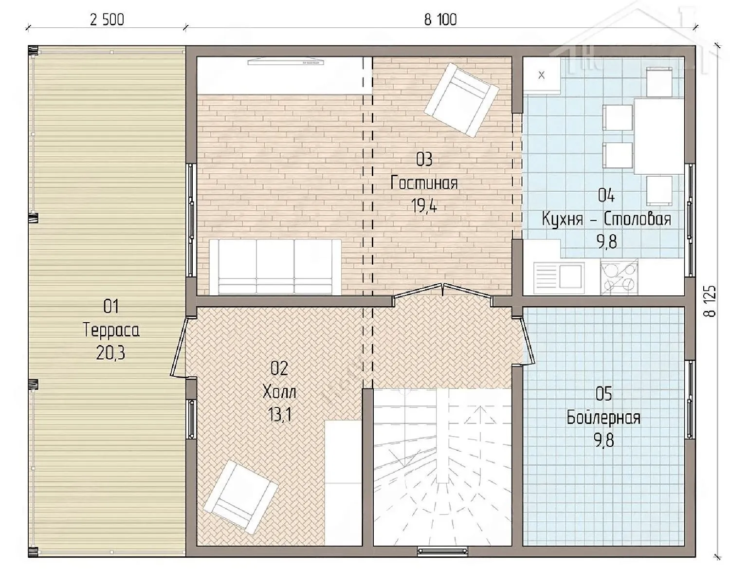 Дом с мансардой 11 на 8 метров, общей площадью 152 м2, из СИП панелей, с бойлерной, террасой и спальней на первом этаже.