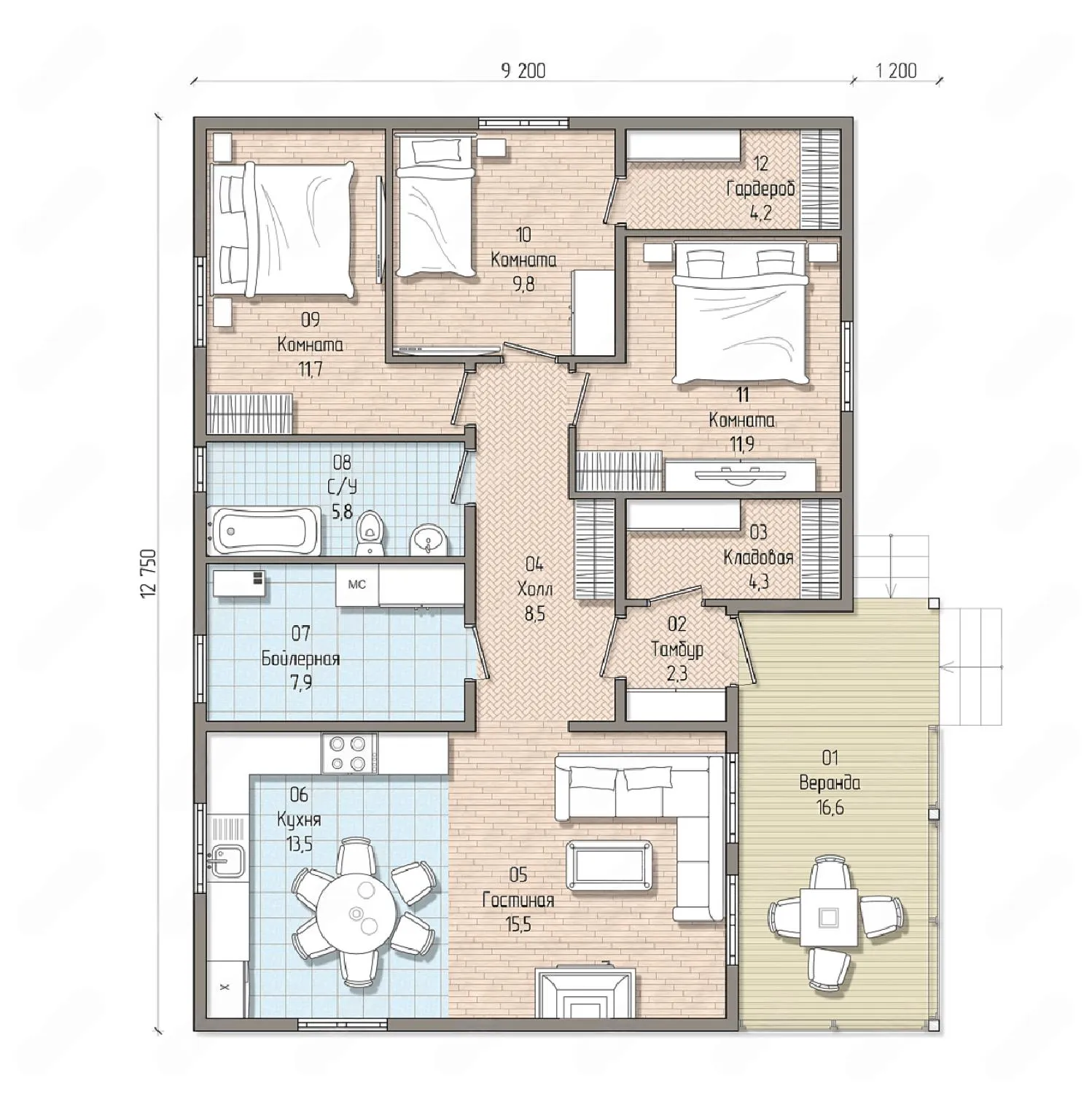 Одноэтажный дом 13 на 10 метров, общей площадью 124 м2, из СИП панелей, с бойлерной, террасой и спальней на первом этаже.
