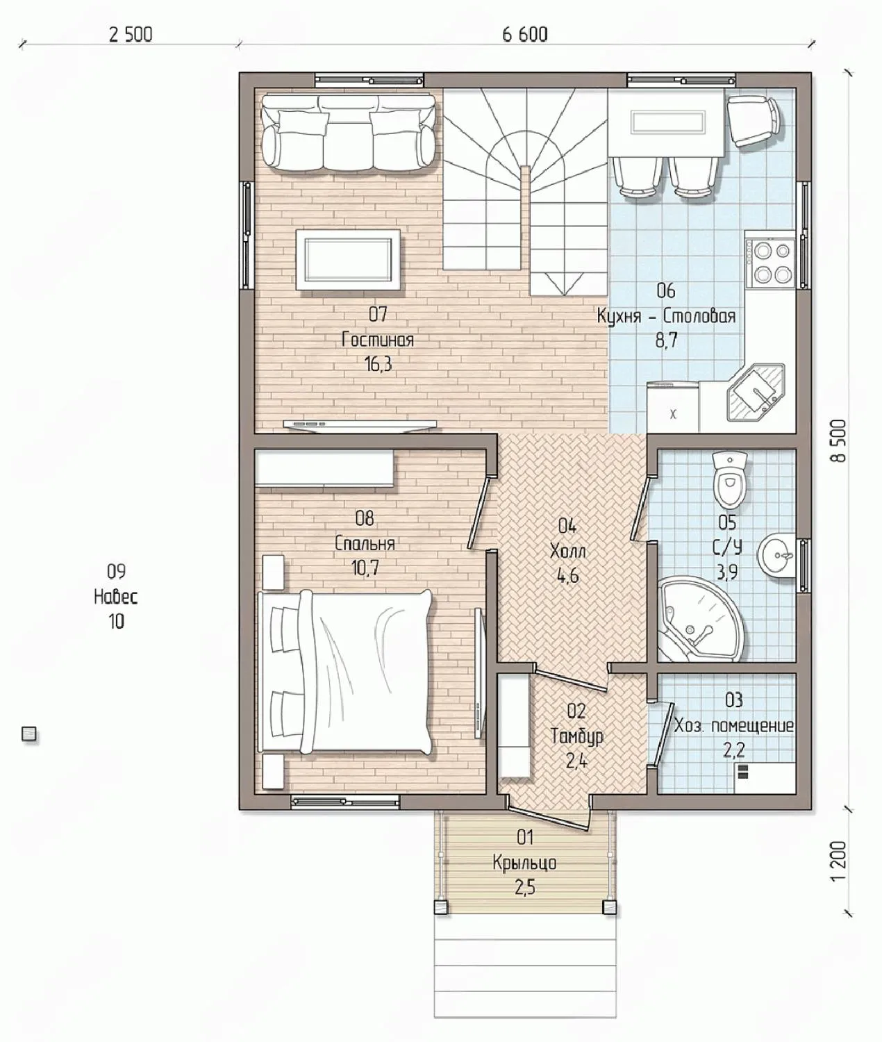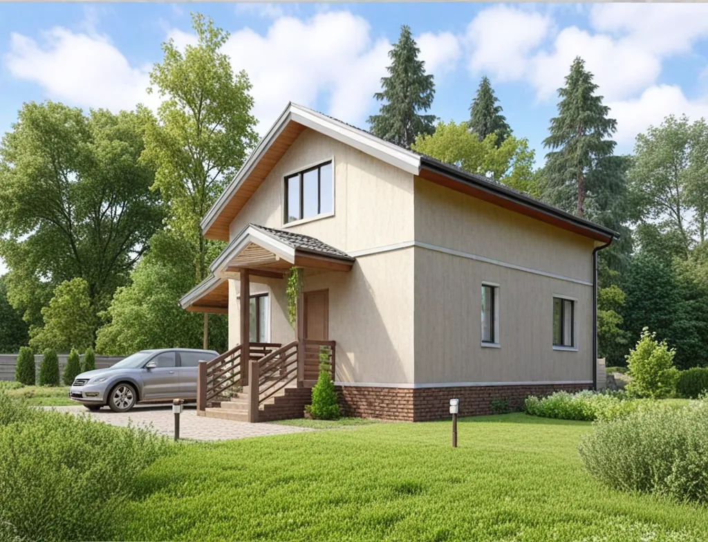 Дом с мансардой 10 на 9 метров, общей площадью 125 м2, из СИП панелей, с навесом и спальней на первом этаже.