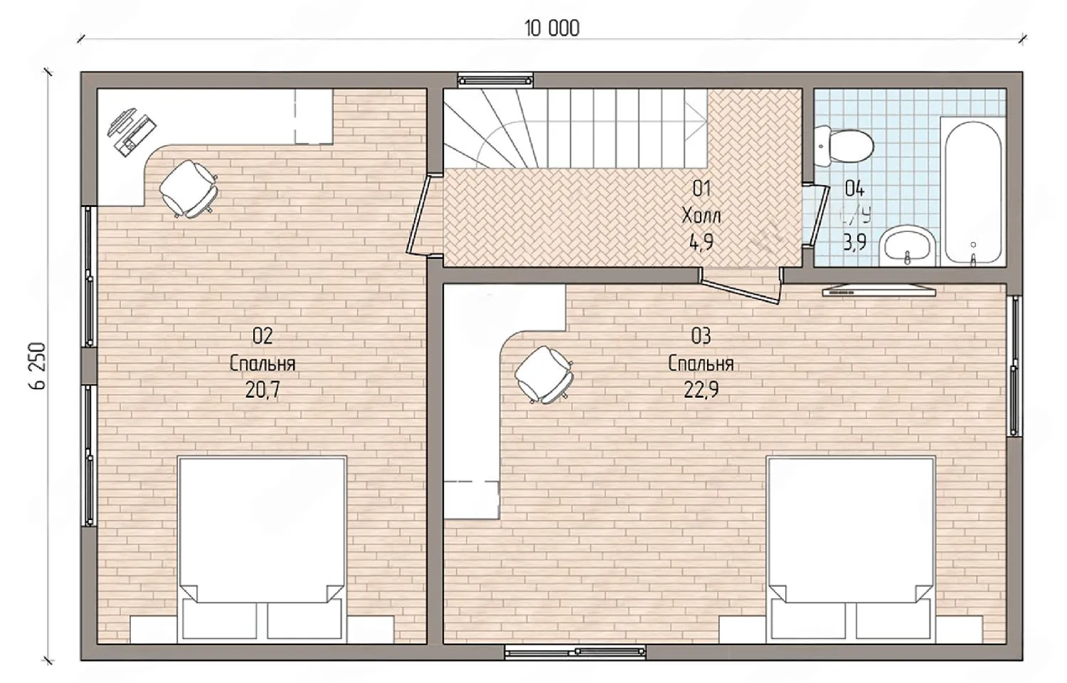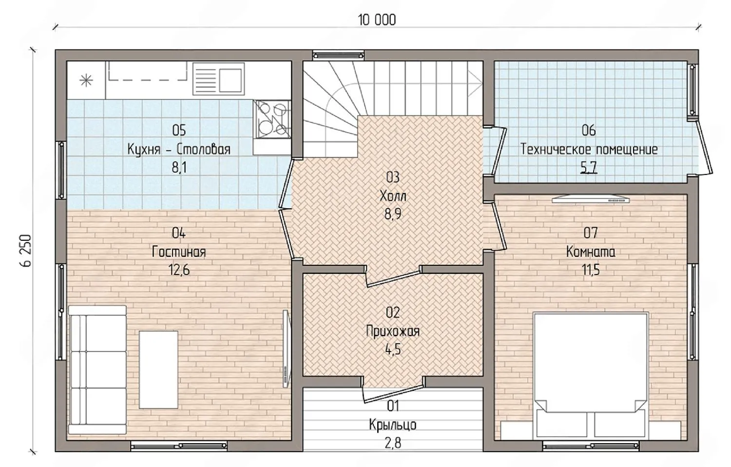 Дом с мансардой 10 на 6 метров, общей площадью 125 м2, из СИП панелей, с бойлерной и спальней на первом этаже.