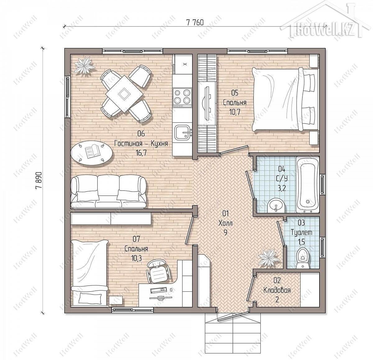 — **Габариты дома:** Дом имеет габариты 7,7 на 7,9 метров, что обеспечивает достаточно места для жизни и отдыха.