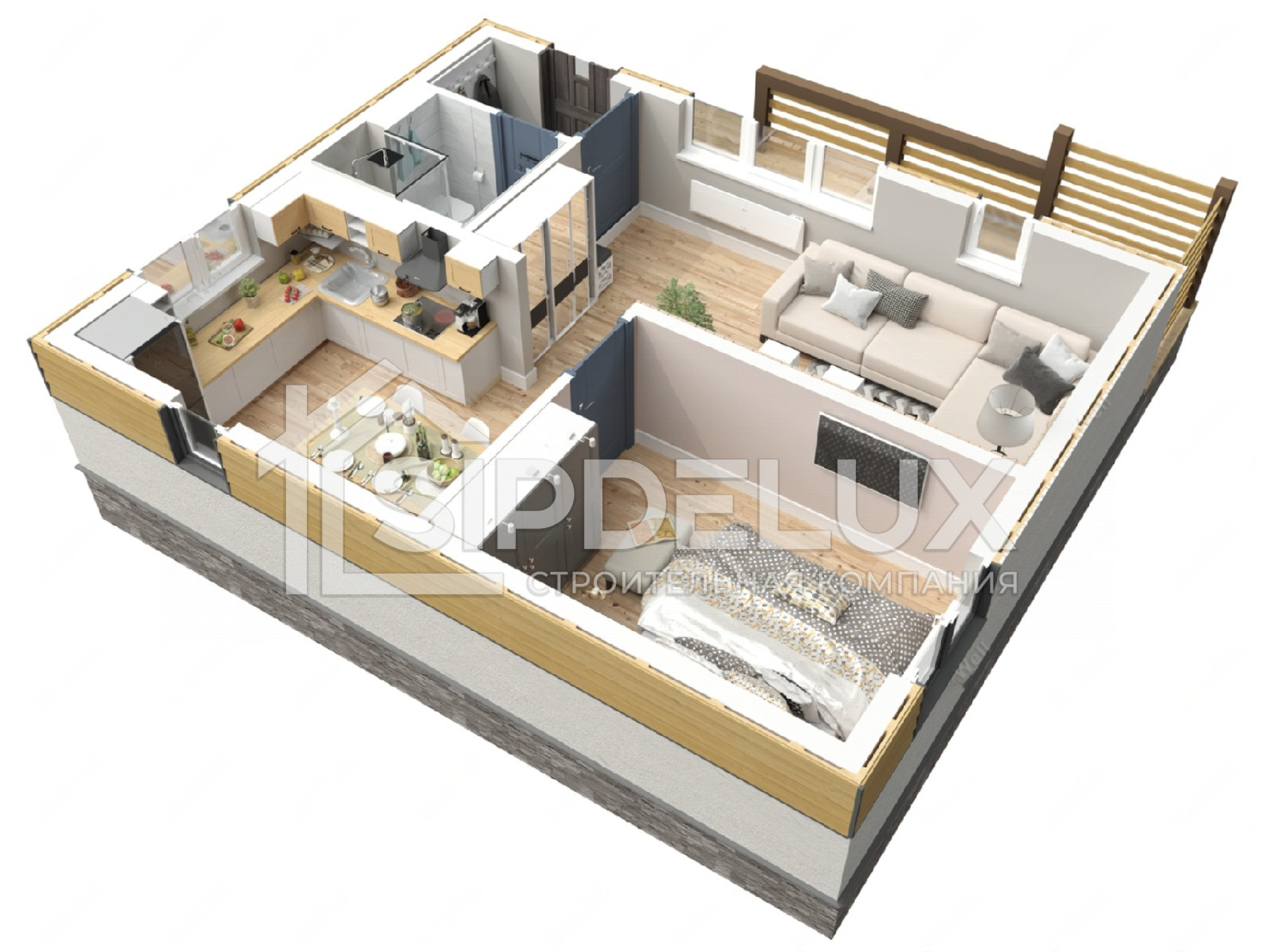4. **Количество спален:** Проект включает 1 просторную спальню, что делает его подходящим для пары или небольшой семьи.