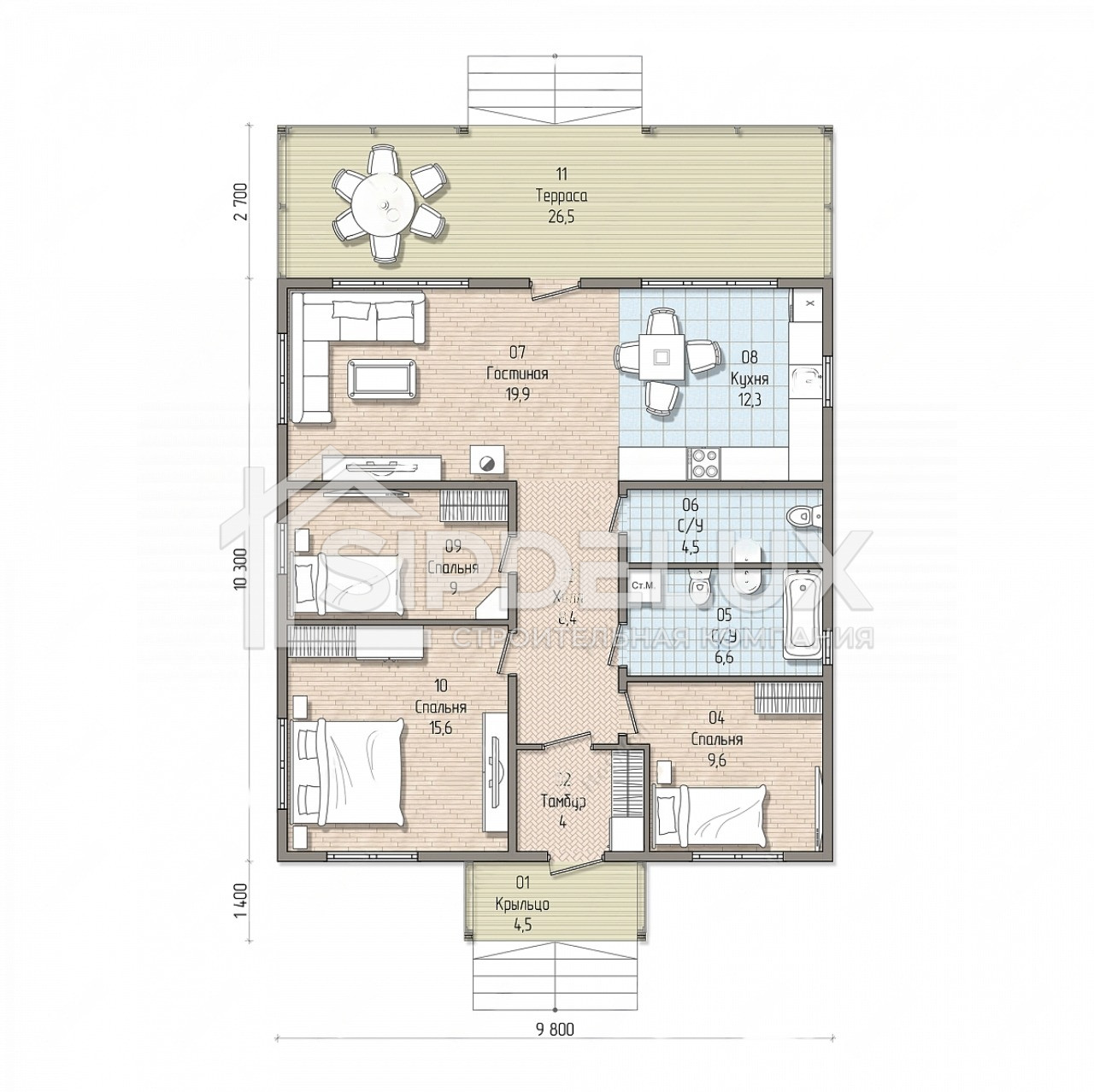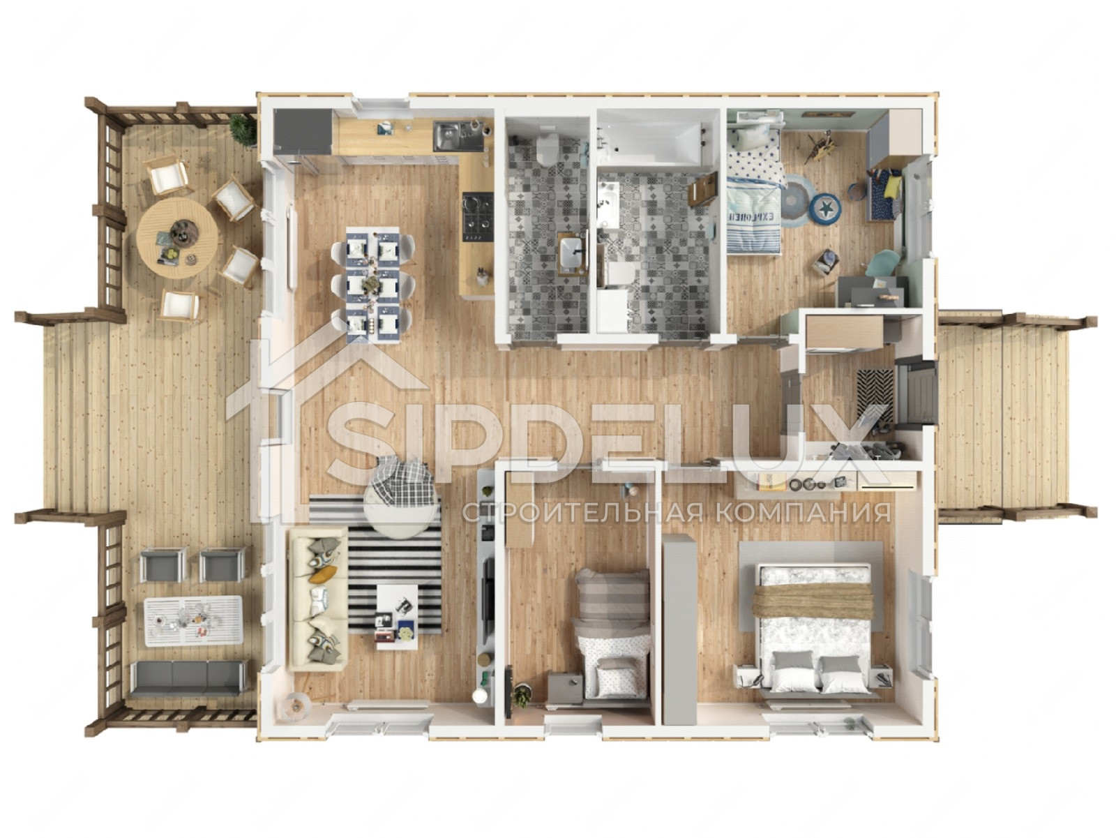 Проект дома К-132 представляет собой современное и просторное одноэтажное жилье, построенное с использованием СИП-панелей (структурно-изолированных панелей). Вот подробное описание этого дома: