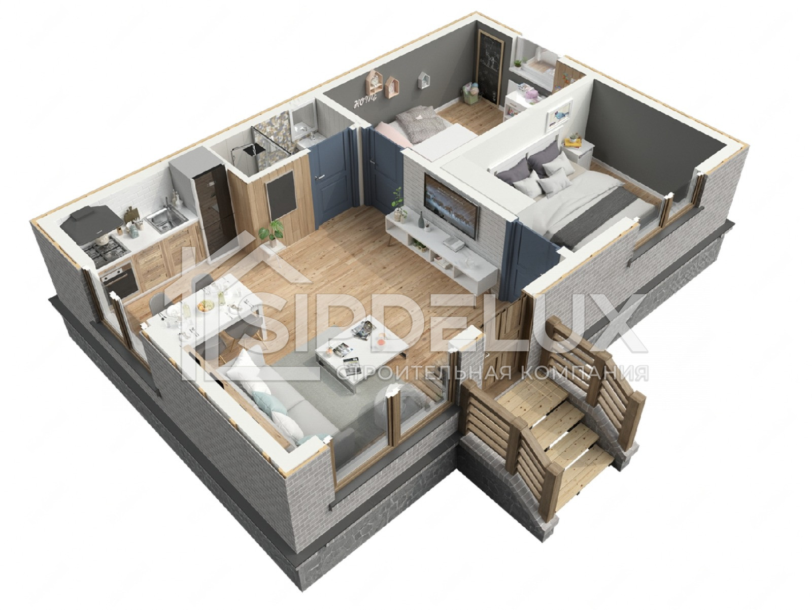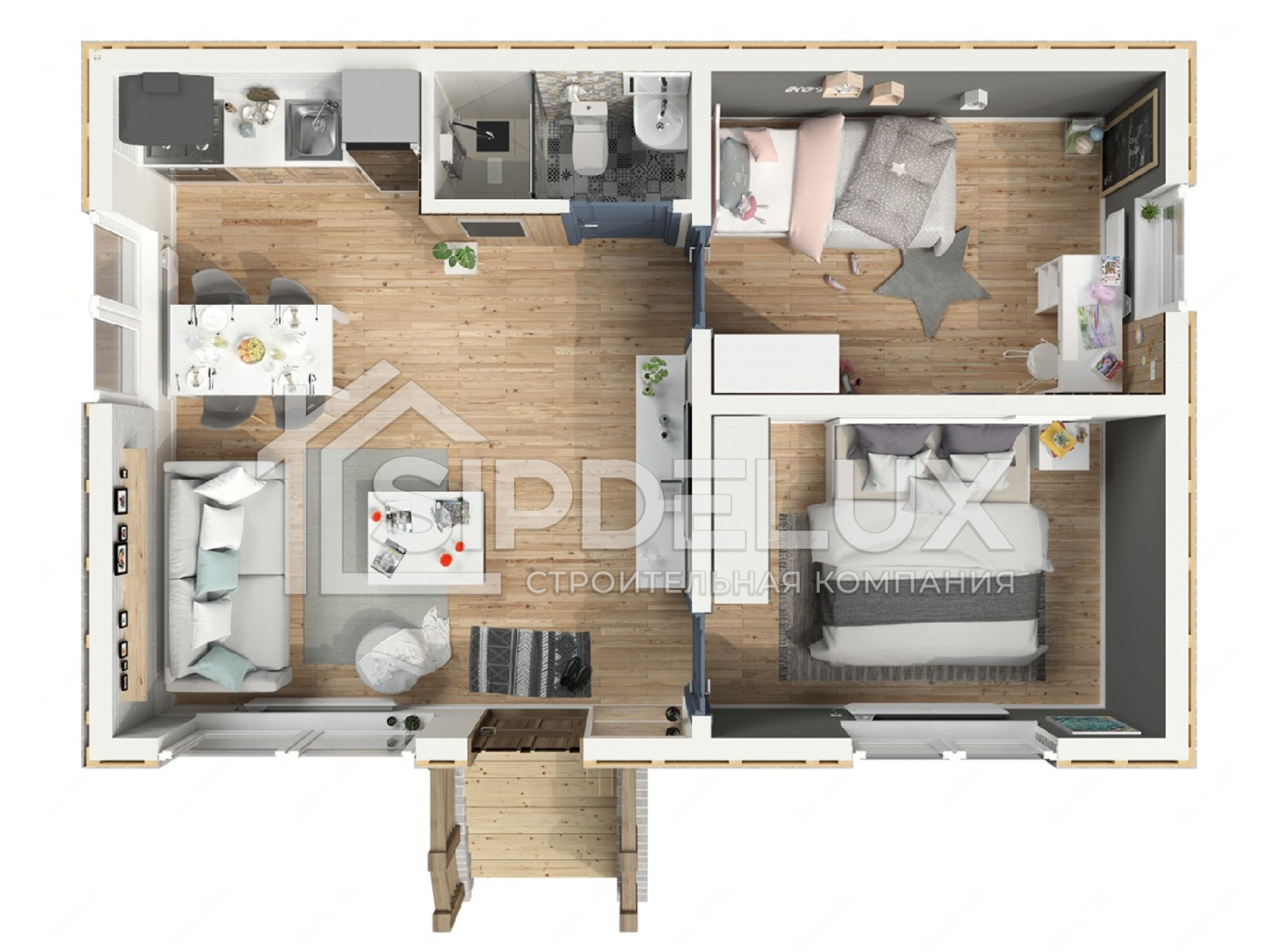 4. **Количество спален:** Проект предусматривает 2 спальни, что делает его идеальным для маленьких семей. Дополнительная спальня может быть использована как гостевая комната или кабинет.