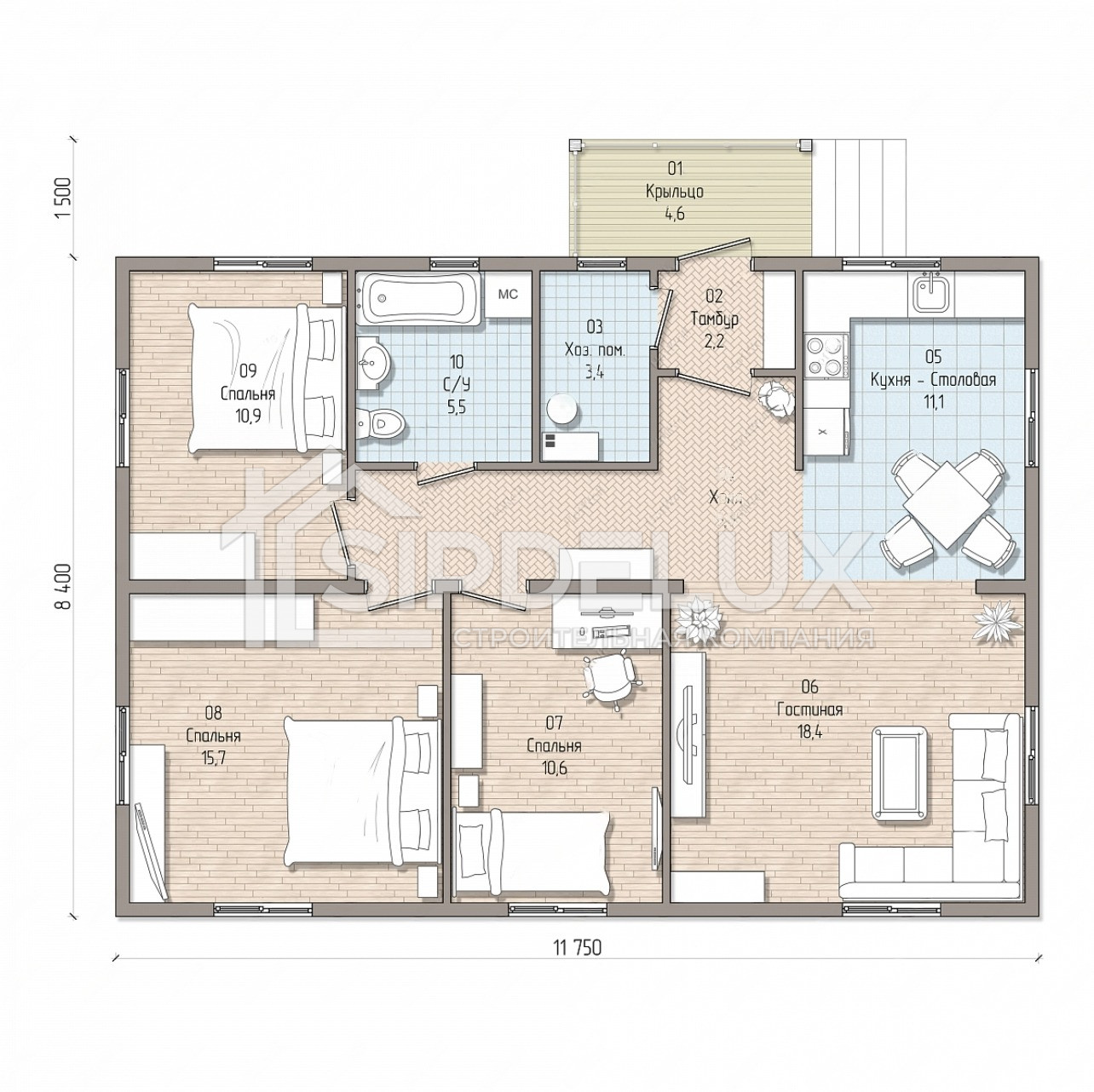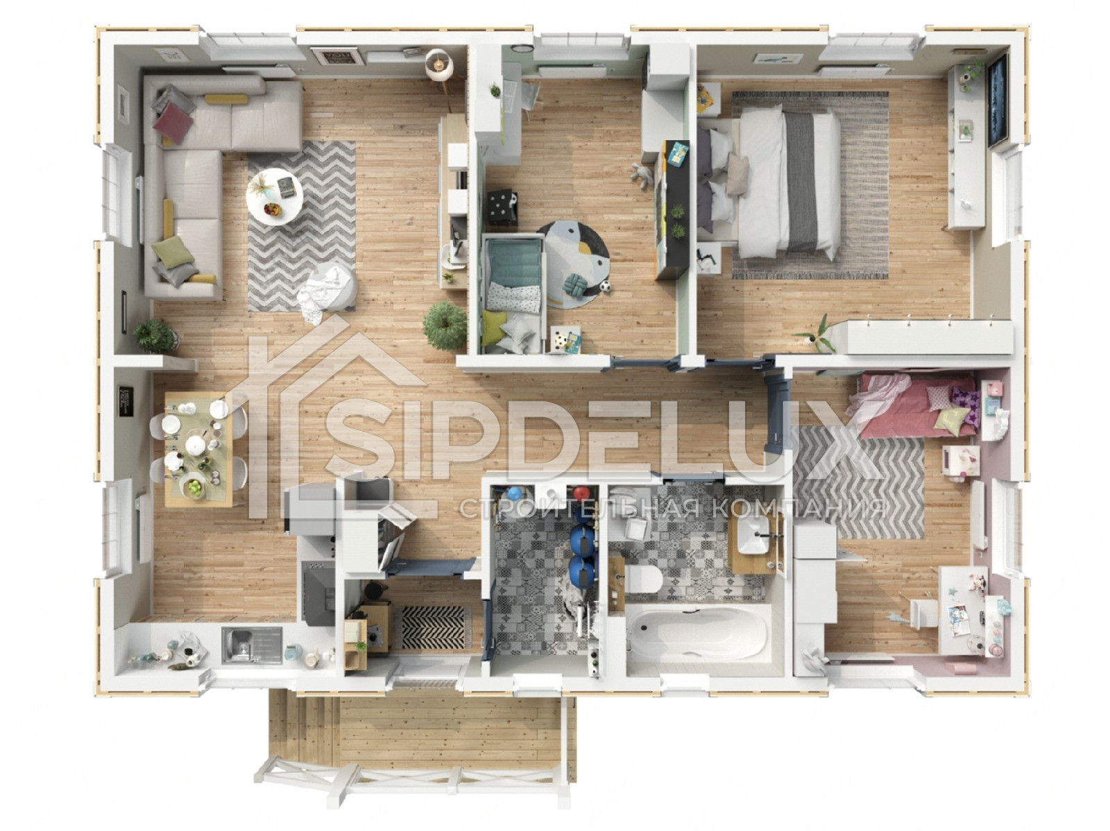 Проект дома Н-104 — это просторное одноэтажное жилье с площадью 104 квадратных метра, построенное с использованием СИП-панелей. Дом имеет 3 спальни и габариты 12 на 8 метров. Крыша дома имеет 2 скатную форму. Этот дом идеально подходит для семей, ищущих просторное и комфортное жилье на одном этаже.