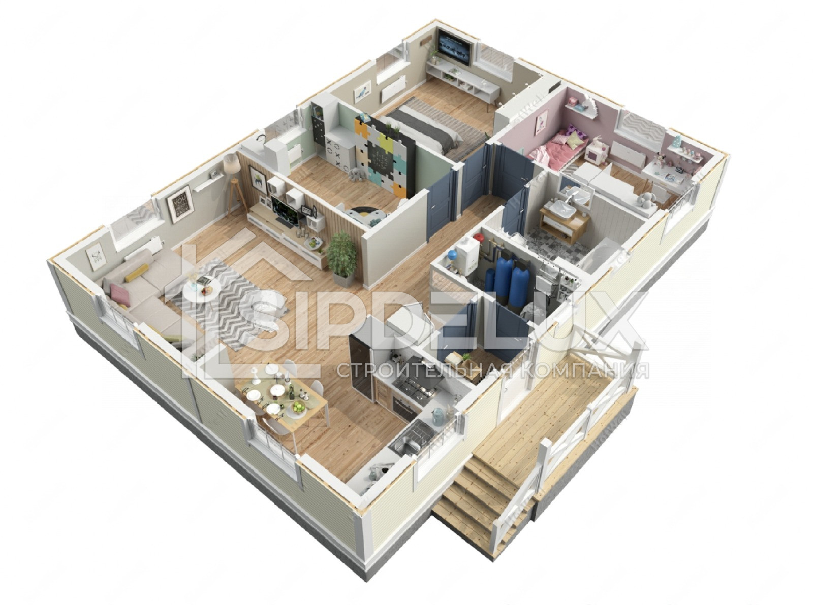 Проект дома Н-104 — это просторное и функциональное одноэтажное жилье, построенное с использованием СИП-панелей (структурно-изолированных панелей). Вот подробное описание этого дома: