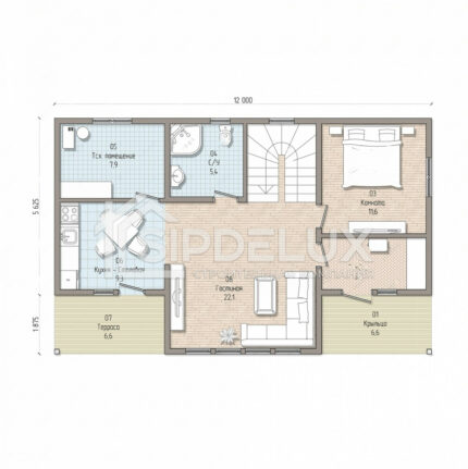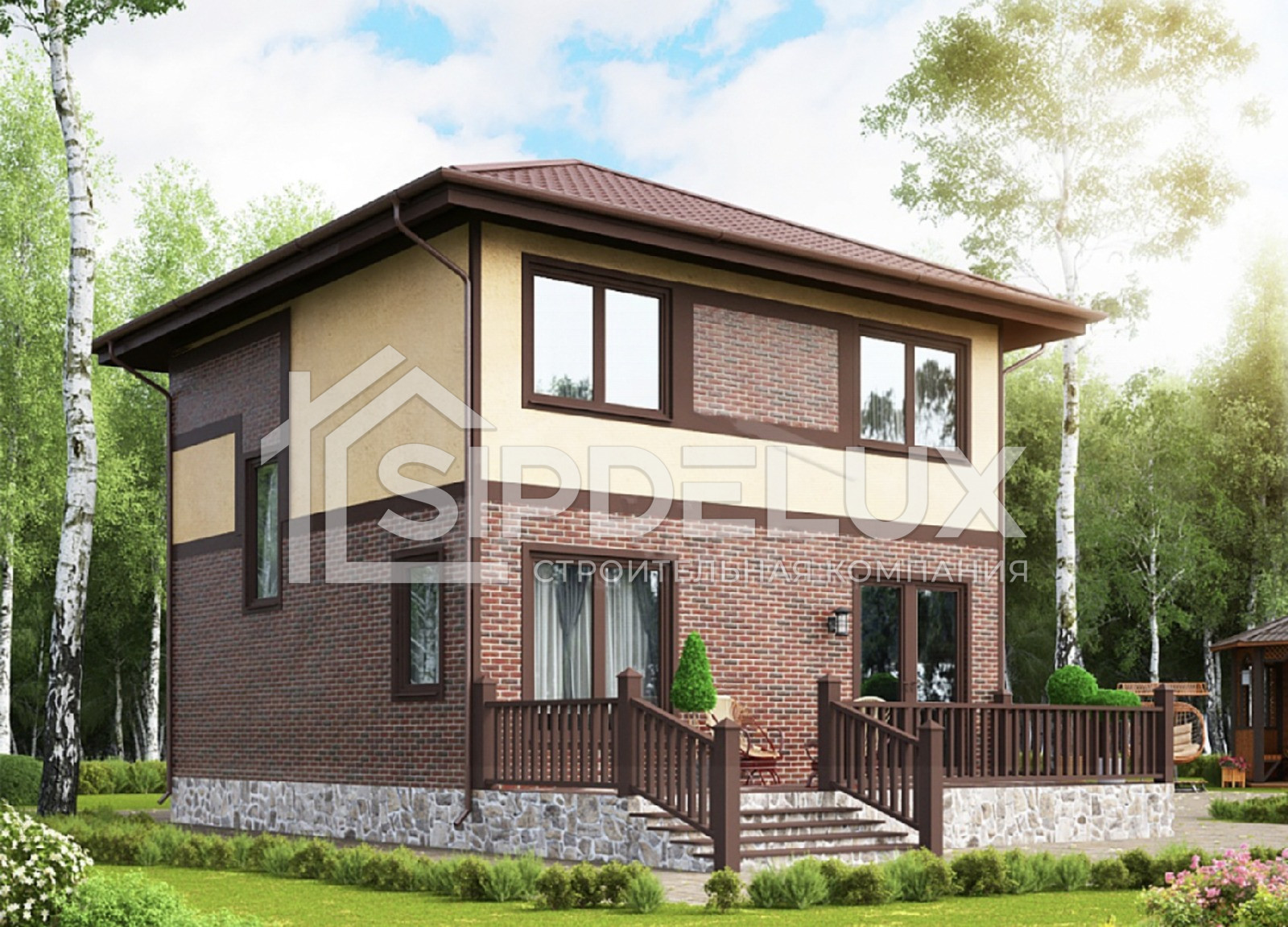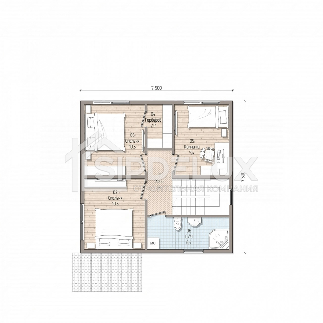 Проект дома Т-135 — это современное двухэтажное жилье, построенное с использованием СИП-панелей. Дом имеет 2 спальни, габариты 7,5 на 7,5 метров, с высотой первого этажа 2,8 метра и второго этажа 2,5 метра. Крыша данного дома имеет 4 ската, что придает ему современный и стильный вид. Этот проект отлично подходит для небольших семей, желающих просторное и современное жилье на двух этажах.