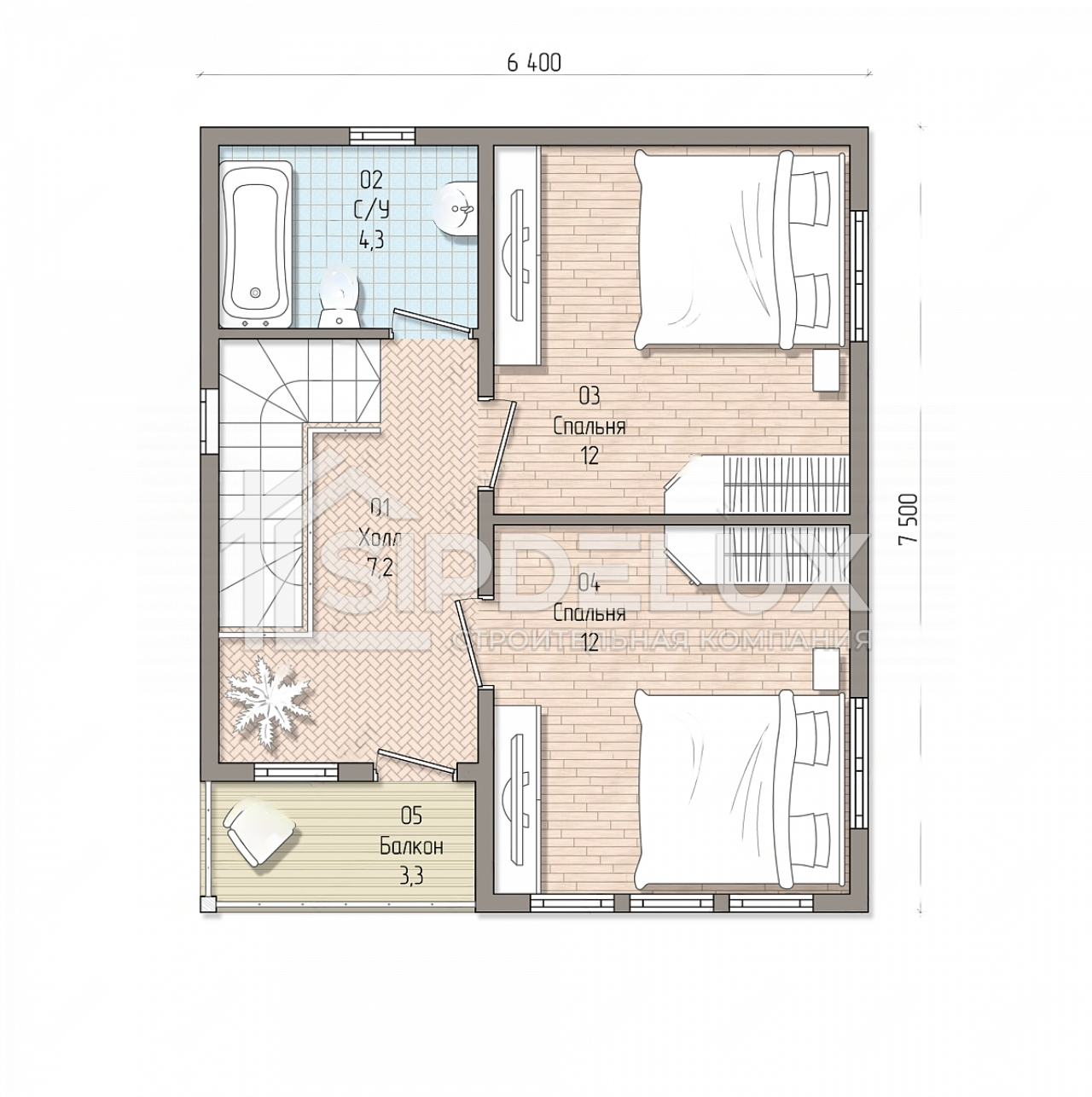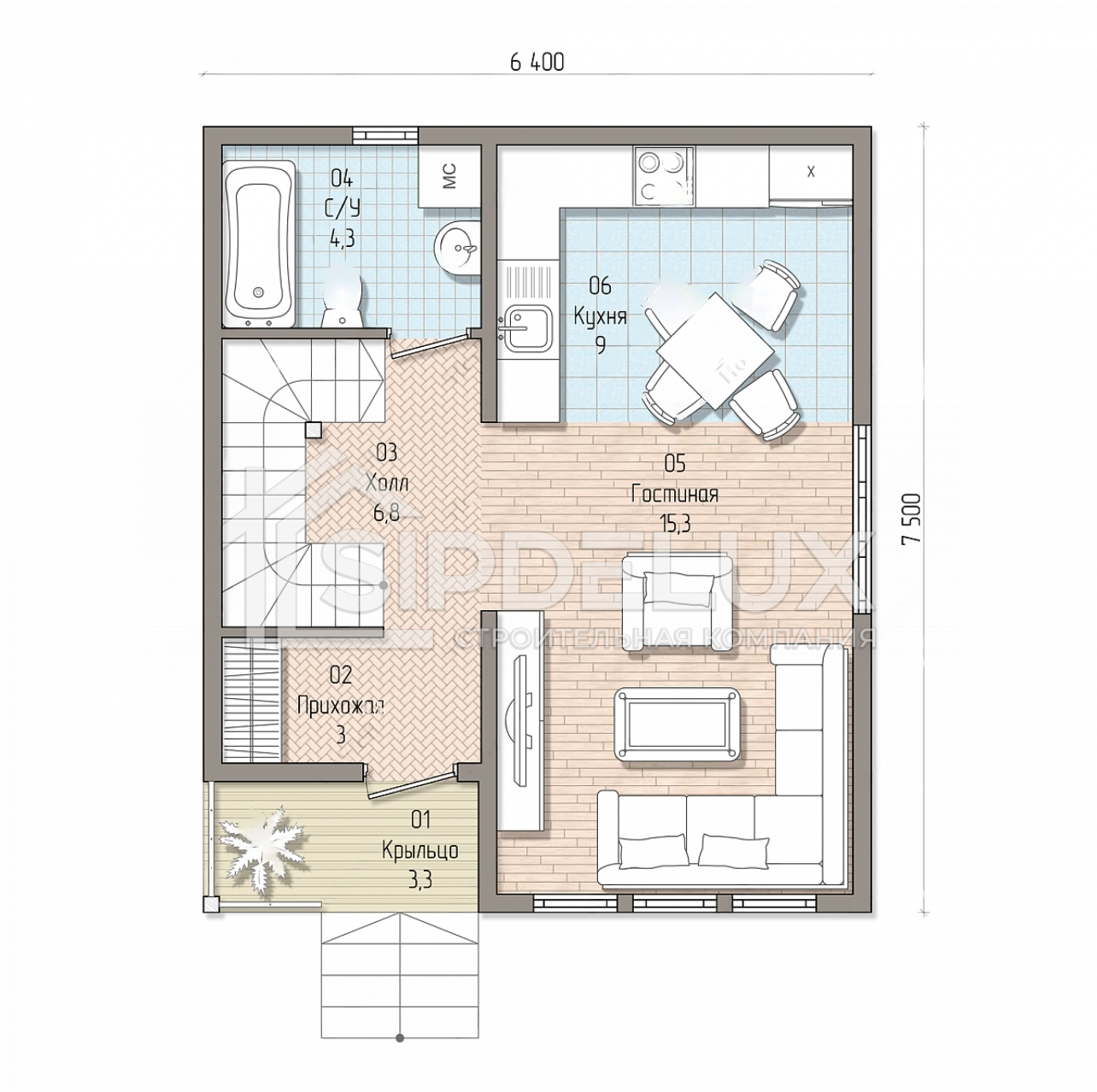 5. **Габариты:** Дом имеет прямоугольную форму с габаритами 7,5 на 6,4 метров, что обеспечивает эффективное использование участка земли и предоставляет много возможностей для ландшафтного дизайна.