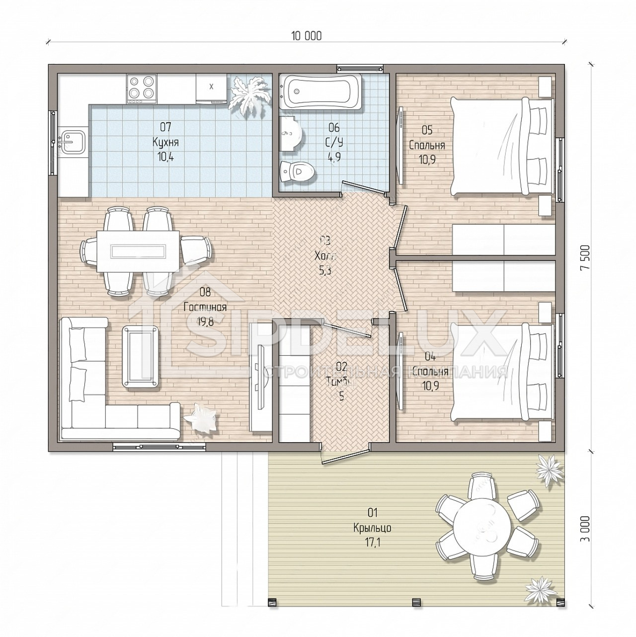 6. **Габариты:** Дом имеет прямоугольную форму с габаритами 10 на 8 метров, что позволяет эффективно использовать участок земли и создавать удобные внутренние пространства.