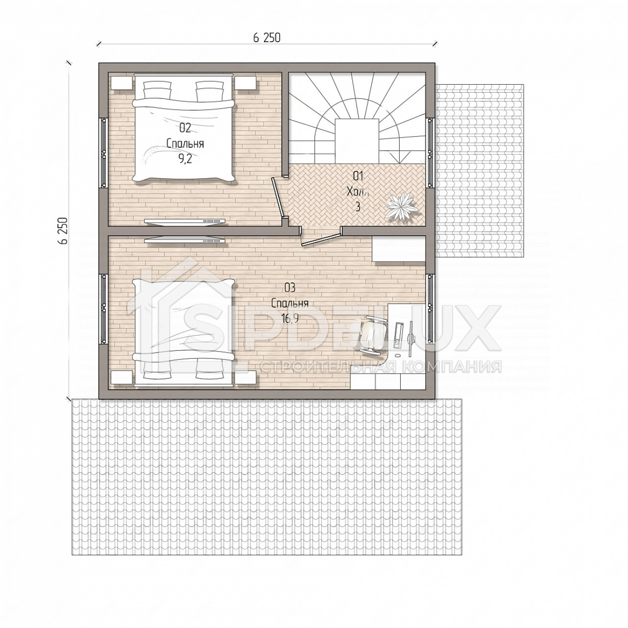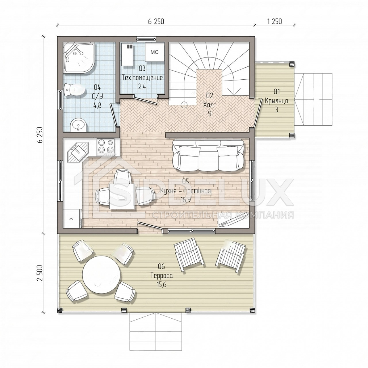 5. **Габариты:** Дом имеет квадратную форму с габаритами 6 на 6 метров, что делает его компактным и позволяет его удобно разместить на участке.